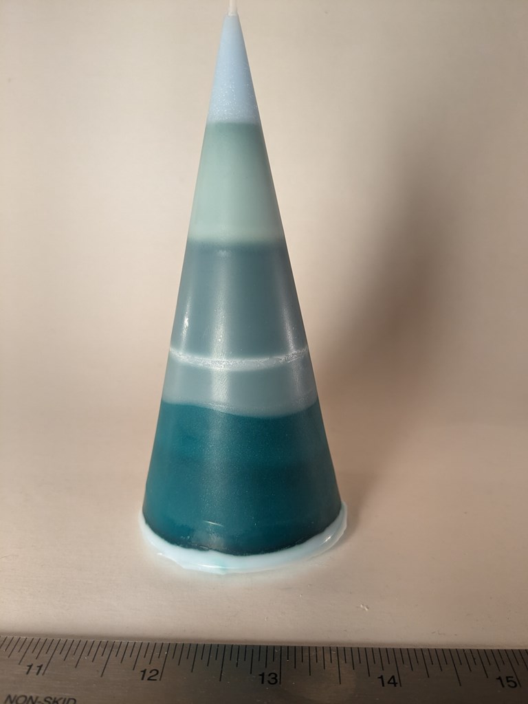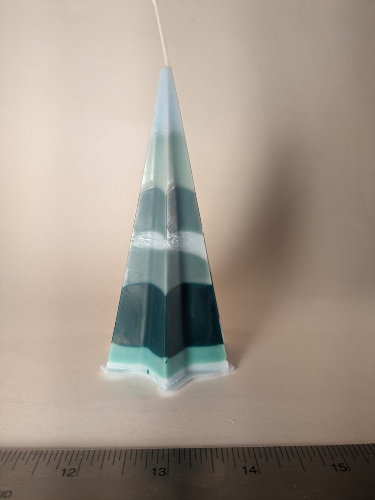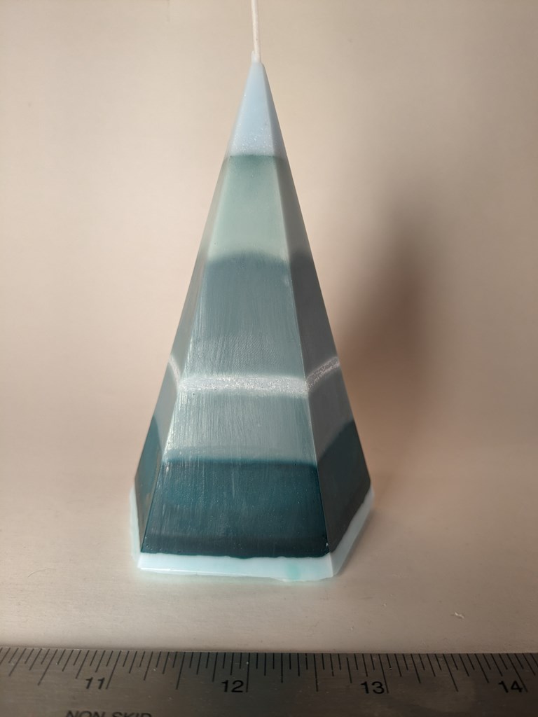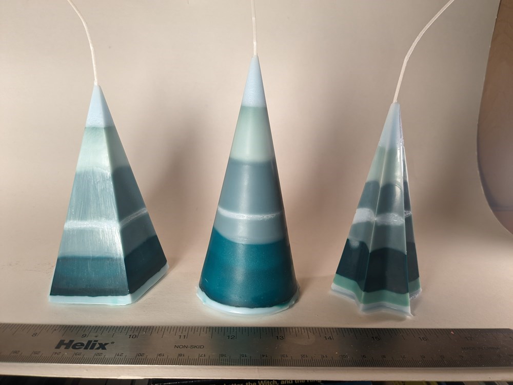 Set of three pyramid candles aspiring to be impressionist fir trees. Pairs well with "Enjoy the Silence." Pentagon Pyramid: 4.8x3x3 in 5.55 oz Star Pyramid: 4.7x2.3x2.3 in 2.4 oz Cone: 5.6x2.5x2.5 in 5.2 oz