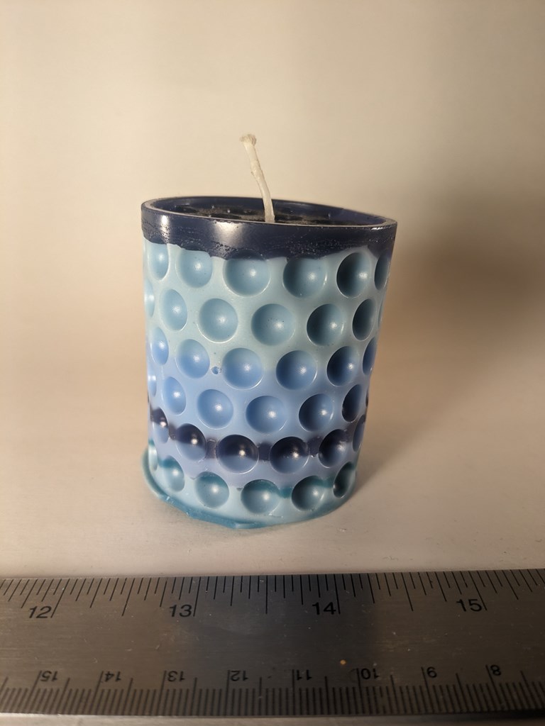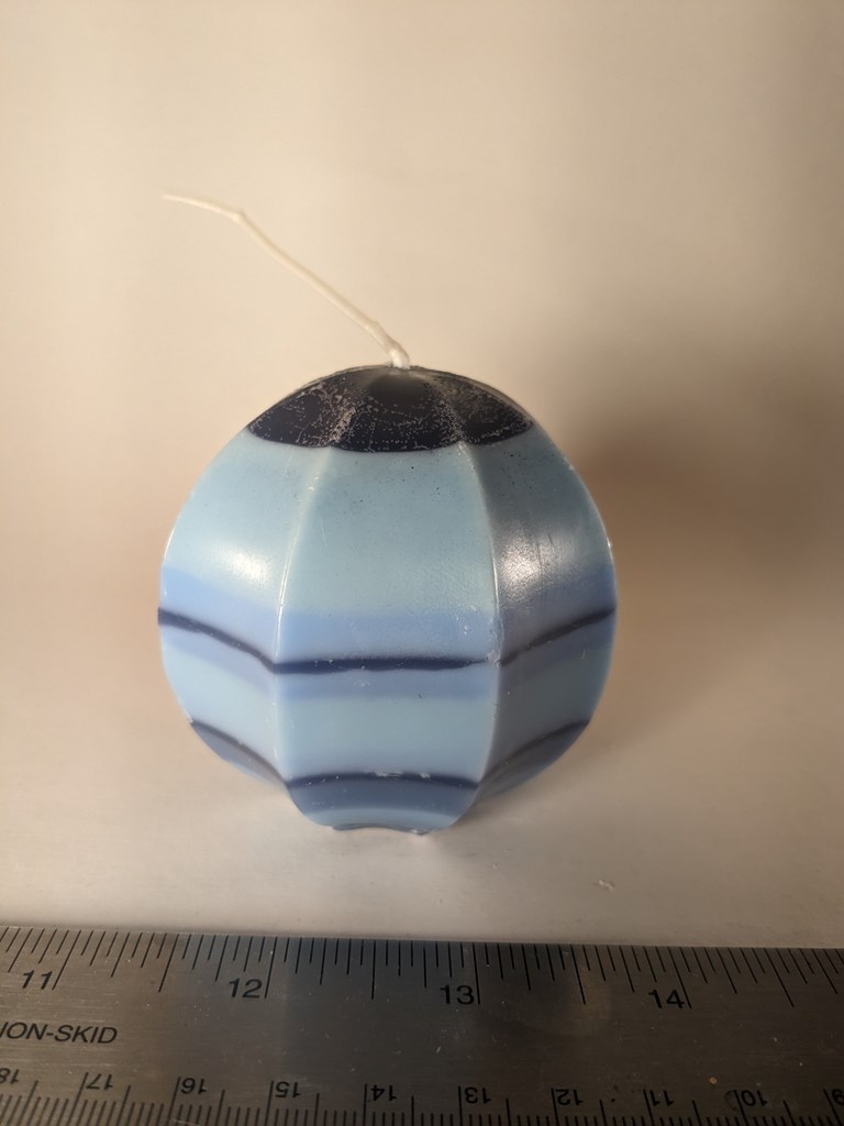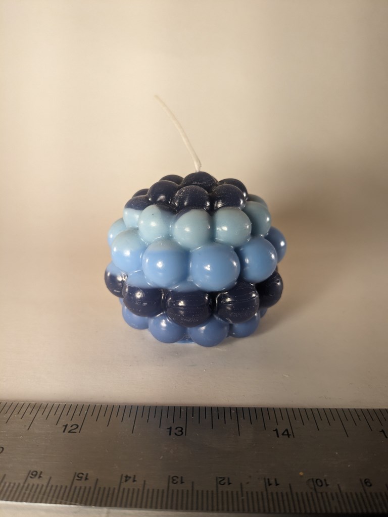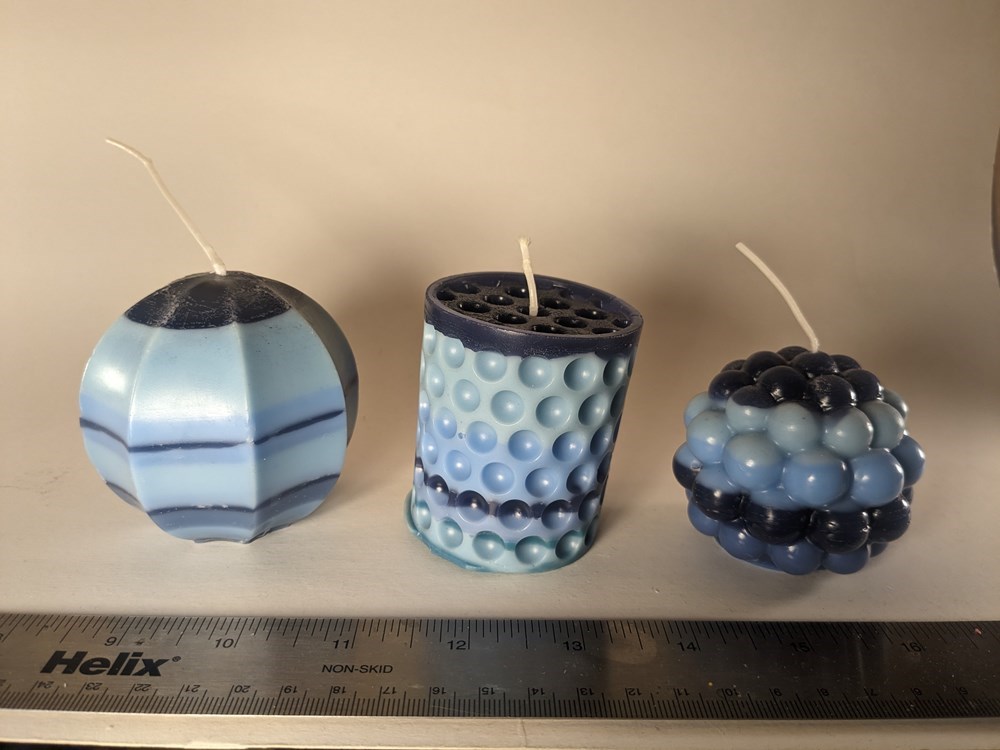 Set of three candles in multiple shades of blue. Full disclosure: the introvert bubble pillar wants to be the Leaning Tower of Pisa. Pairs well with "Ice Machine." Scalloped Sphere: 2.9x3x3 in 6 oz Introvert Bubble Pillar: 2.6x2.6x2.6 in 4.85 oz Bubble Sphere: 2.5x2.5x2.5 in 3.5 oz