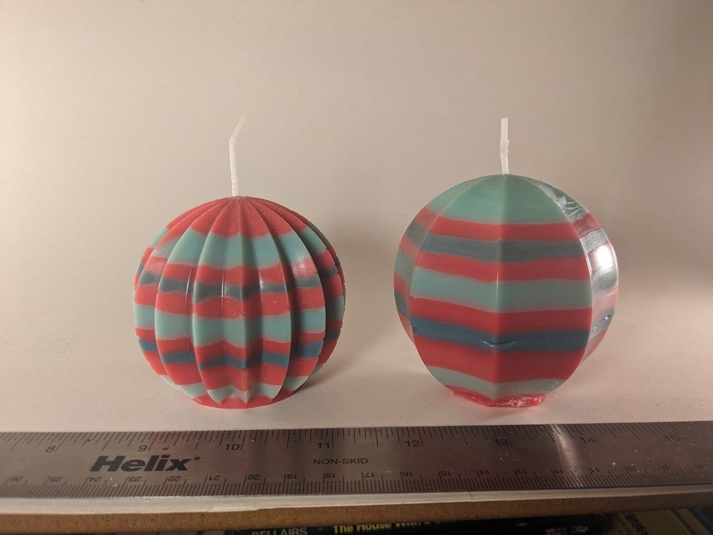 Two of my best. In my opinion, these are the belles of the ball, or the balls of the ball, I guess, but they are my favorites. Pairs well with "But Not Tonight." Pleated Sphere: 2.7x2.9x2.9 in 4.8 oz Scalloped Sphere: 2.9x3x3 in 6 oz